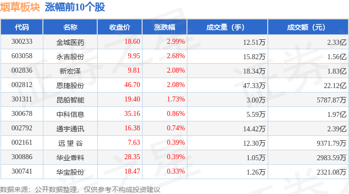 烟草板块9月30日涨004%金城医药领涨主力资金净流入391873万元股票推荐官网_今日牛股+明日潜力股全解析_短线+长线策略每日更新