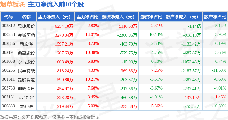 从资金流向上来看,当日烟草板块主力资金净流入3918.73万元,游资资金净流入8822.8万元,散户资金净流出1.27亿元。烟草板块个股资金流向见下表: