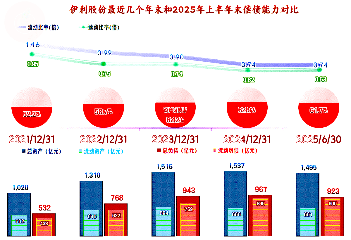 伊利股份的长期偿债能力是相当强的,短期偿债能力看起来在持续下降,我们前面已经说过,其还有大额存单等放到了长期资产里去了,再加上规模较大的企业,指标方面一般会控制得低一些,否则造成的闲置浪费就太大了。