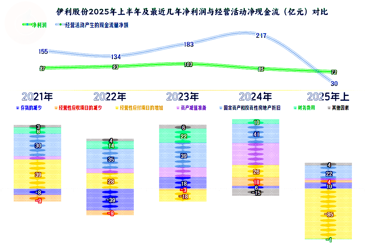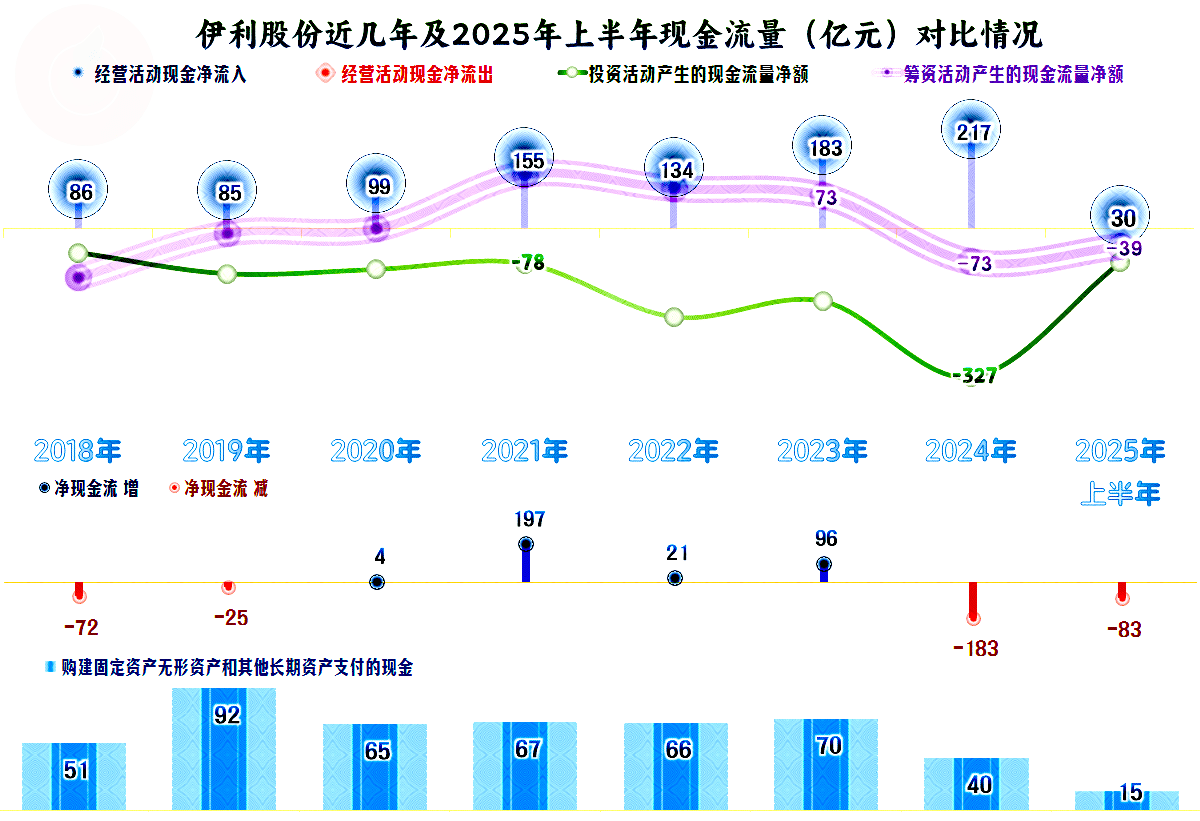 “经营活动的现金流量净额”表现相当好,2024年并未受净利润下跌的影响,创下了超200亿元的夸张水平,毕竟减值损失是不需要支出现金的。固定资产的投资规模持续在近70亿元规模之后多年,2024年和2025年上半年有明显下降。原因当然是产能过剩,老厂都开工不足,再建新厂的必要性不是太大了。至于说为何“投资活动产生的现金流量净额”高达300多亿元,这是因为大额存单这类也算投资,再加上伊利股份还有金融业务,这些就不细说了。