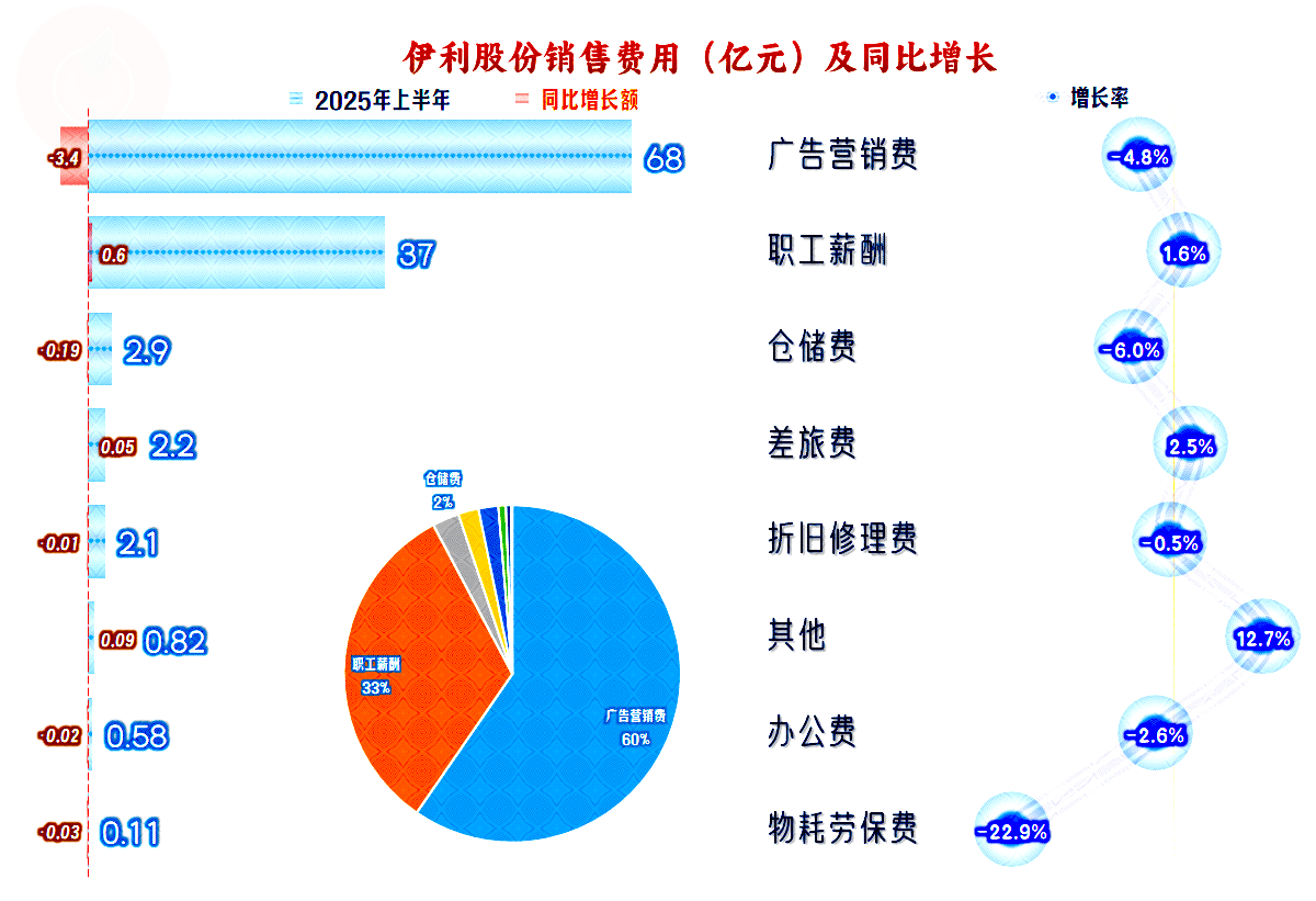 “广告营销费用”是其占比六成的第一大销售费用,2025年上半年略有下跌,能在营销投入下降的情况下,取得营收增长,还是挺牛的。“职工薪酬”是其占比1/3的第二大销售费用,同比有所增长,增速不及营收快,也算是合理的。销售费用的支出虽然金额较高,但问题似乎并不大。