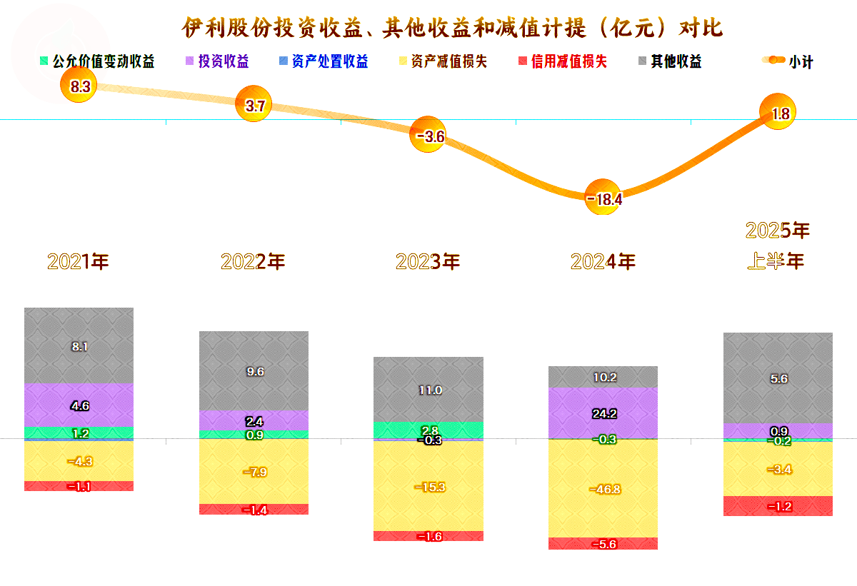 损失项主要是“资产减值损失”和“信用减值损失”,2024年及以前都有增长的趋势,特别是2024年增长特别猛,2025年上半年已经明显好转。
