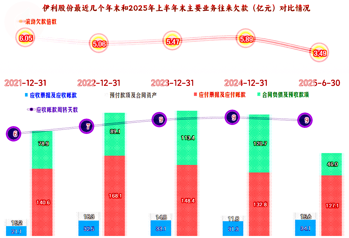 2025年上半年末的“合同负债”大幅下降了超80亿元,原因是预收经销商的货款减少。为何会减少呢?经销商们的合同地位提升是合理的解释,如果是同行们都大幅降低订金的比例,不跟的话,就会非常被动。当然,如果有人非要解释为企业的社会责任和商业信誉提升,我们也不想反对。