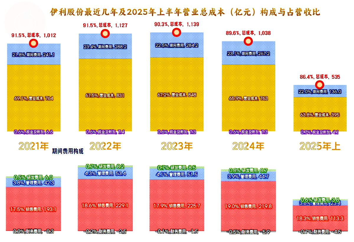 毛利率在疫情下跳水,并不全是疫情的影响,同样有新收入准则,要求对原计入销售费用中的运输费等计入到营业成本的原因。之后的四年半,毛利率持续增长,2025年上半年达到了36.1%的高水平,虽然还不及疫情前,但由于营业成本内容的变化,估计会比以前的峰值水平高出2-5个百分点。