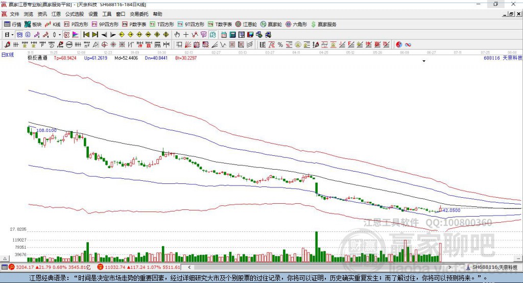 基本面:天奈科技现价45.75, 涨幅6.97%。今日处于“赢家江恩软件”极反通道工具“弱势通道”区域