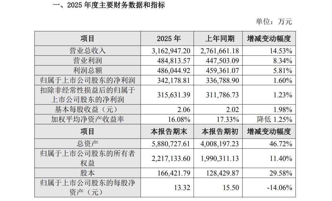股本方面,因2025年6月实施2024年度权益分派方案,以资本公积金每10股转增3股,公司年末股本达16.64亿股,同比增长29.58%;受股本转增影响,归属于上市公司股东的每股净资产为13.32元,同比下降14.06%。