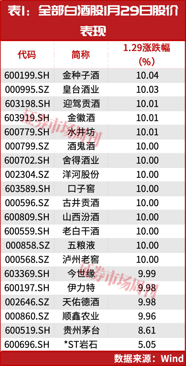 先看白酒板块,无疑是“否极泰来”的典范。2月2日-2月5日,中证白酒指数4连阳,且前置观察期发现,1月28日触底反弹后,指数1月29日成功收出了9.79%的单日涨幅,板块中20只个股,18只涨停(见表1)。