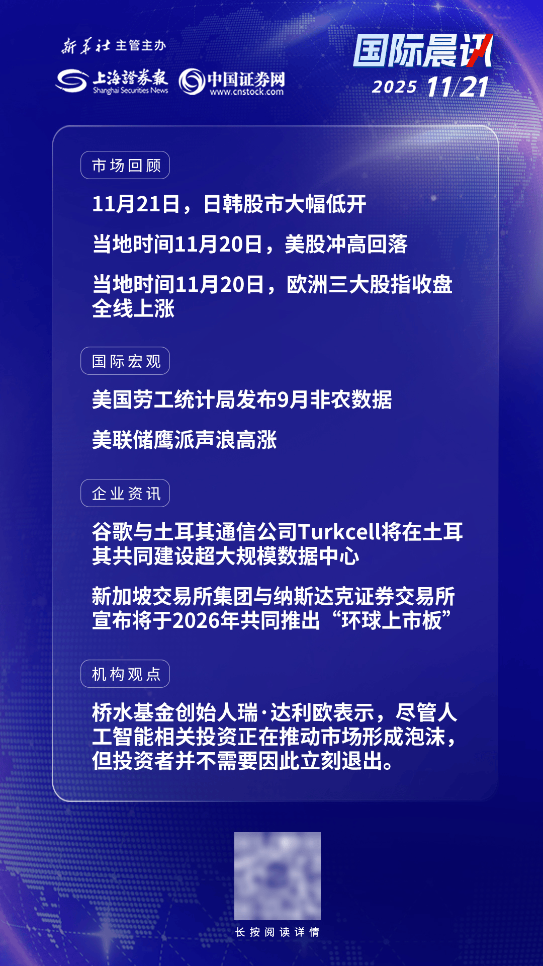2025-11-22股票推荐,今日牛股,短线股票推荐,明日股票推荐,热门板块分析/每日精选A股潜力牛股,覆盖短线爆发股与长线价值股,附技术图形、资金动向与题材热点分析,助您提前抓住风口,精准进场!北京时间11月21日,日韩股市大幅低开;当地时间11月20日,美股冲高回落;欧洲三大股指收盘全线上涨。美国劳工统计局发布9月非农数据;美国劳工统计局发布9月非农数据;美联储声浪高涨。谷歌与土耳其通信公司Turkcell将在土耳其共同建设超大规模数据中心;新加坡交易所集团与纳斯达克证券交易所宣布将于2026年共同推出“环球上市板”。